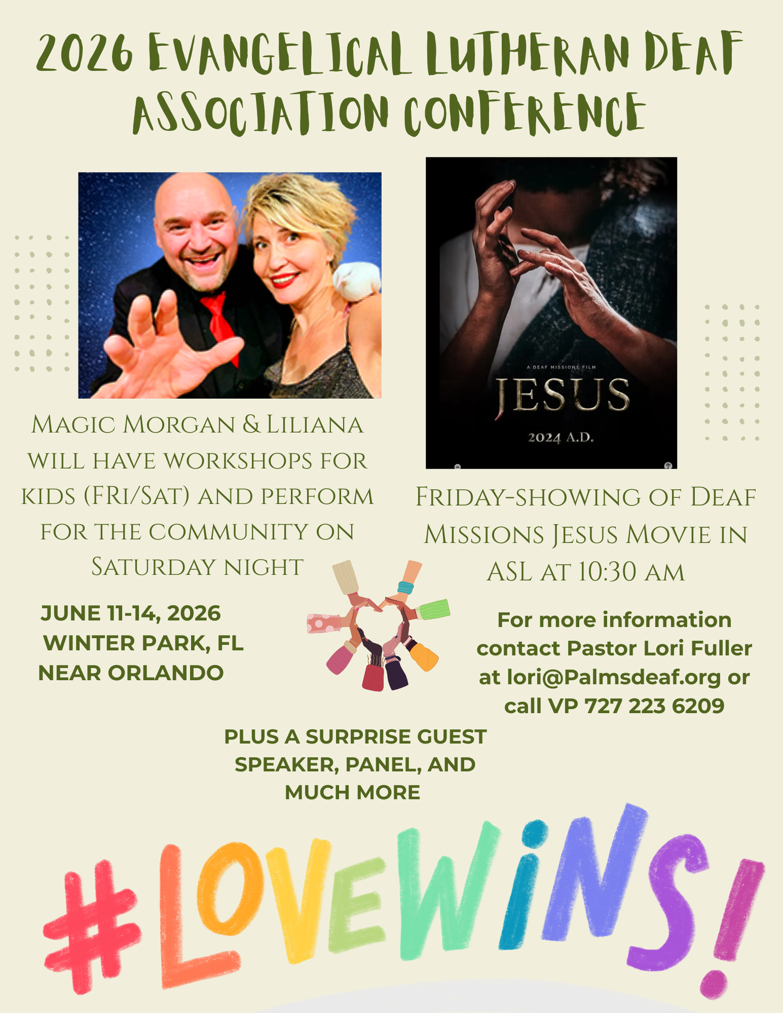 "The Evangelical Lutheran Deaf Association (ELDA) is a national Lutheran organization of Deaf ELCA congregations, interpreted ministries, and their members which supports a core value of ASL and American Deaf Culture. ELDA advocates Deaf spirituality and empowerment, Deaf global missions and youth outreach, interpreter training, and hosts a biennial conference.